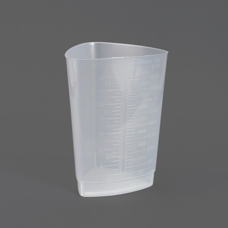 Recipiente triangular graduado transparente. Graduación en onzas (Oz) y centímetro cúbico (cc/ml).